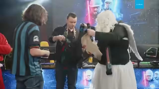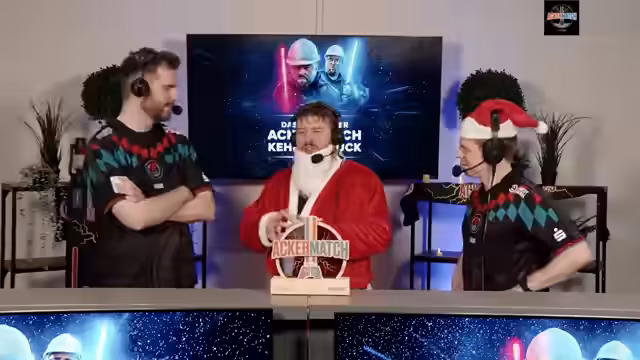 01:01:41Nach dem intensiven Spiel geht der Stream zu weiteren Aktivitäten über. Die Spieler des Hauptteams und des Zweitteams werden kurz interviewt. Genax (Toplane des Zweitteams) äußert Freude über das Spiel und lobt die gute Zusammenarbeit. Kutschi (Support des Zweitteams) bedauert leicht den Verlust, betont aber den Spaß am Spiel. Der Weihnachtsmann kündigt an, dass die Spieler später nochmals auftreten werden, und verabschiedet das Publikum mit einem Applaus für beide Teams.