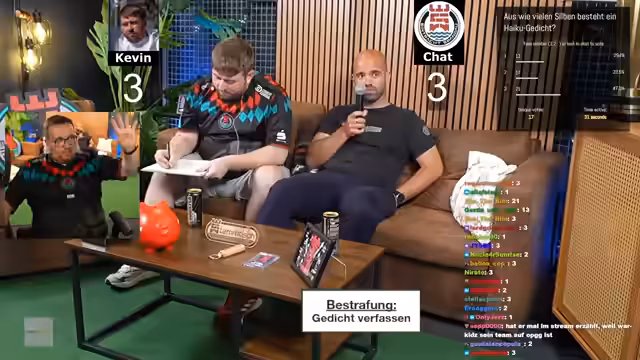 00:41:17Das Segment 'Kevin vs. Chat' beginnt mit der ersten Frage nach dem Austragungsort des A1-Cup-Finales, die Kevin korrekt beantwortet. Im Verlauf der fünf Fragen, die hauptsächlich Wien und Esports-Wissen betreffen, gewinnt der Chat knapp mit 3 zu 2 gegen Kevin. Als Belohnung für den Sieg erhält der Chat ein positives Gedicht über Kevin, das dieser nun verfassen muss. Dies führt zu großer Freude und gelebter Mitarbeiterkultur im Stream.