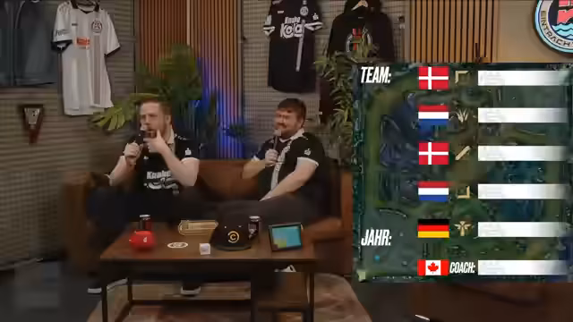 00:34:58Ein Spiel wird gestartet, bei dem die Streamer versuchen, die Zugehörigkeit von Teams anhand von Flaggen zu erraten. Eine unbekannte Flagge mit einem Schlüssel sorgt für Verwirrung, bis sie als Wappen von Stuttgart identifiziert wird. Anschließend wird über aktuelle Line-ups gesprochen, insbesondere das neue Team von VfB Stuttgart in der First Divison und ehemalige Teams wie Alliance, deren Spieler als sehr stark, aber auch als toxisch beschrieben wurden.