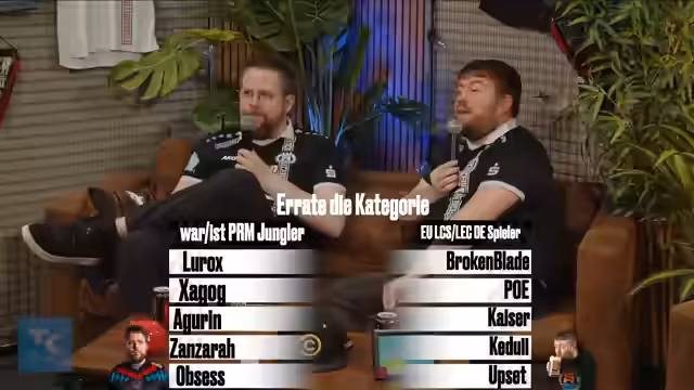 01:13:31Die Streamer beginnen mit einer interaktiven Rätselrunde, bei der sie versuchen, Kategorien von LoL-Teams zu erraten. Ein Teilnehmer schlägt vor, dass gesuchte Teams alle deutschen Top-Laner in ihrem Roster haben. Eine andere Theorie besagt, es könnten ehemalige EU-LCS-Finalisten sein. Die Diskussion ist von häufigen Fehlversuchen und gegenseitigem Spicken geprägt. Die Streamer betonen die hohe Schwierigkeit der Aufgabe, da die Lösung aus der Box gedacht werden muss.