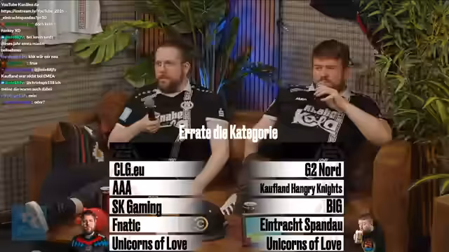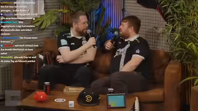 00:09:52Der Stream begrüßt zur Fanmeile vor dem Spiel gegen G2 Nord. Es werden die positiven Eigenschaften des Gegner-Teams hervorgehoben, wie gute Laune und Skill. Streamer Broeki und Kevin erwähnen ihre persönliche Stimmung und ihre Musikvorlieben, bevor sie gezielt einzelne Chat-Namen begrüßen. Hierbei werden besonders treue Fans als „die wahren Eintracht Spandau Ultras“ bezeichnet und erwähnt, dass einige von ihnen aus Berlin angereist sind.