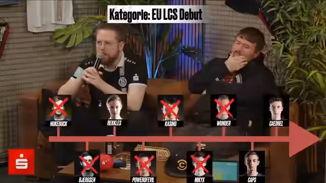 00:29:51Der Streamer berichtet über die aktuellen EMEA Masters, insbesondere über das gestrige Spiel von G2 North gegen Big. Er äußert sich kritisch zur Spielführte und nennt es zwar unterhaltsam, aber nicht qualitativ hochwertig. Er erklärt den aktuellen Stand des Turniers, einschließlich der Lower-Bracket-Spiele. Anschließend wechselt er zu einem interaktiven Segment mit der Community. Die Zuschauer sollen die Reihenfolge der Debüt-Spieler der EU LCS in der richtigen Chronologie sortieren. Der Streamer und seine Co-Moderatoren diskutieren dabei intensiv über die richtigen Jahreszahlen und die Karrierestarts der Spieler.