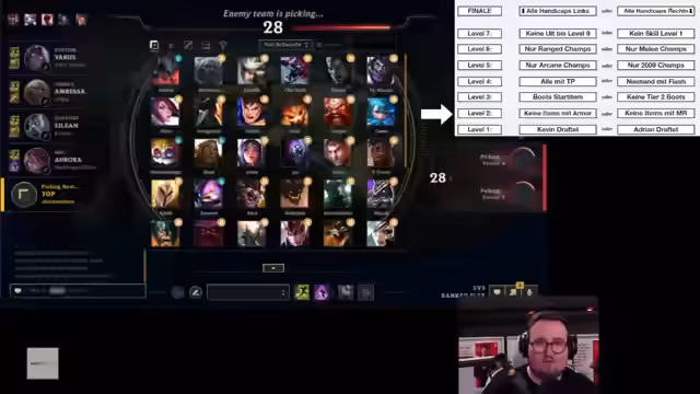 01:28:18Nach einem kurzen Wechsel der Technik beginnt eine neue Runde, diesmal als Teil der FlexQ Challenge. Ein spezielles Regelwerk wird implementiert: Für jeden Sieg steigt das Team eine Stufe auf, mit zusätzlichen Einschränkungen wie dem Verzicht auf bestimmte Items oder das Spielen nur mit Champions aus bestimmten Jahren. Die Coaches und der Streamer diskutieren Rollenverteilung und strategische Picks für das erste Spiel.