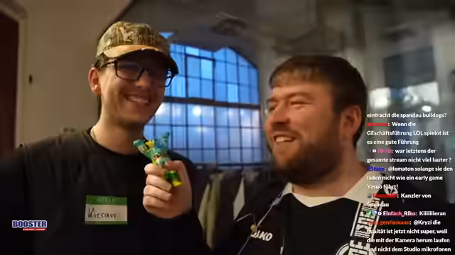01:32:58Frank Becker, der Bezirksbürgermeister von Spandau, erscheint im Stream und gratuliert zum neuen Büro. Er ist ein Fan von Eintracht Spandau und bewundert die positive Darstellung von Spandau. Er überreicht ein kleines Geschenk, einen Spandauer Buddy-Bier, und verspricht eine größere Variante bei Fußball-Erfolgen. Er zeigt große Erwartungen an die Teams.