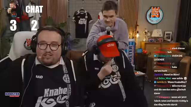 01:54:59Ein Quiz mit dem Titel "Kevin gegen Chat" startet, bei dem Kevin gegen den Chat antreten muss. Der Verlierer soll eine Zwiebel essen. Die Fragen reichen von League of Legends-Kartenspielen bis zur Geschichte von Rossmann. Kevin gewinnt das Quiz knapp mit 4 zu 3 und entgeht so der Strafe. Der Chat muss Adrian die Zwiebel essen, was er mit Bravour meistert.