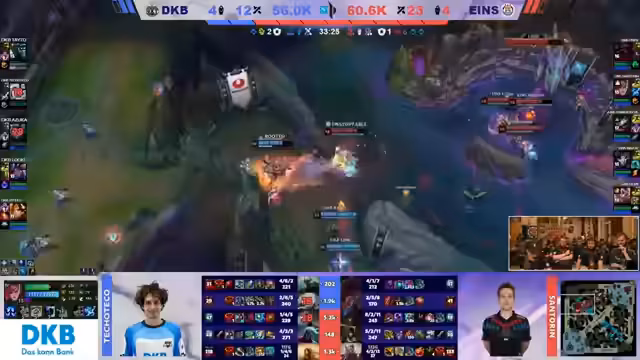 07:01:07Eintracht Spandau schafft es, nach einem harten Kampf in die 'Mid-Game' Phase zu kommen und mit einem signifikanten Goldvorteil zu dominieren. Tristan Schräger auf der Mid-Lane ist mit einem Vorsprung von 3000 Gold ein entscheidender Faktor. Die Analysten sehen die Haupt-Win-Condicion darin, mit langreichweitigen Picks wie Kog'Maw und Jhin die Gegner zu 'poken' und so dem eigenen Team Sicherheit für Objektive wie den Baron Nashor zu verschaffen. Die gegnerische DKB zeigt durch Fehlpositionierungen und voreilige Fights Schwächen, die das Spandau-Team ausnutzen kann.