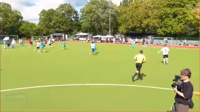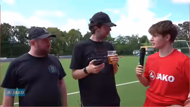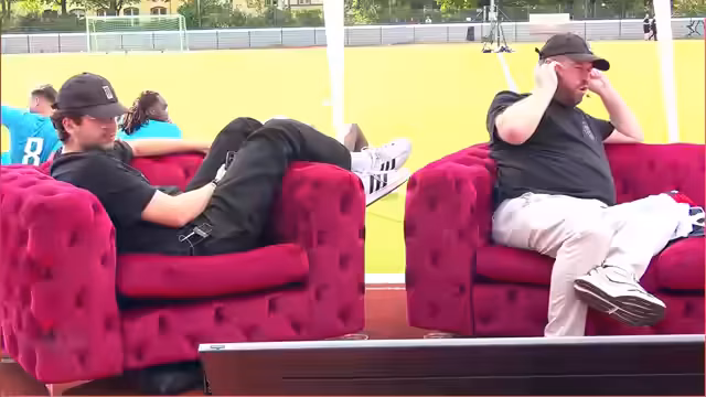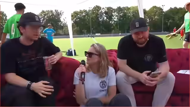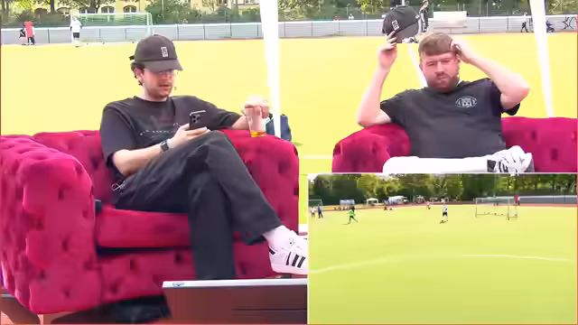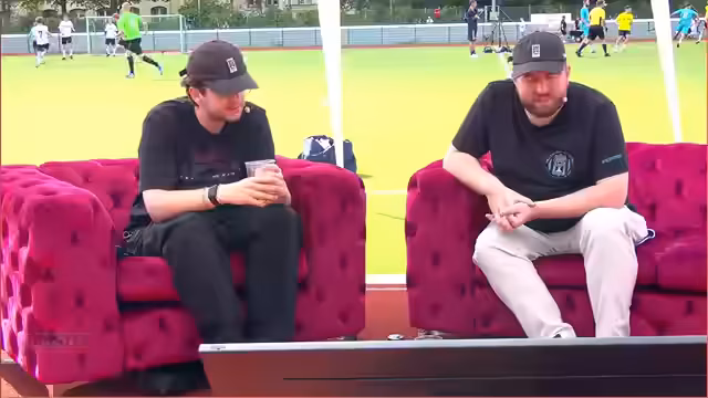 00:27:21Es wird der Standort, das Stadion Haselhorst, vorgestellt, auf dem der erste Eintracht Spandau e.V. spielt. Es sind zwei Kleinfelder aufgebaut, die so groß wie Baller League-Felder sind. Es finden zwölfminütige Spiele in zwei Gruppenphasen statt, gefolgt von Halbfinale und Finale. Der Spielplan kann über einen QR-Code abgerufen werden, der live verfolgt werden kann. Nach dem Herren-Turnier gibt es ein Trikot-Reveal und ein Frauen-Turnier. Zuschauern, die am Handy schauen, wird erklärt, wie sie den QR-Code abscannen können. Die Moderatoren machen sich auf die Suche nach Hannes, um Sonnencreme zu holen, da die Sonne stark scheint. Sie vermuten, dass Hannes die Sonnencreme gemopst hat und laufen ihm hinterher. Sie filmen den Weg und zeigen den Zuschauern die Location.