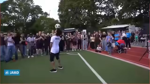 01:55:54Die Trikotvorstellung des ersten Eintracht Spandau Trikots steht an. Es wird erwähnt, dass das Trikot und die Jacke online erworben werden können. Die Frauenmannschaft präsentiert das neue Trikot, und Mo Jamal zeigt seine Fußballkünste. Maira äußert sich begeistert über das Trikot und lobt die Möglichkeit zur Mitgestaltung. Die Zuschauer werden nach ihrer Meinung zum Trikot gefragt. Abschließend gibt es noch eine Freestyle-Einlage mit dem Ball.