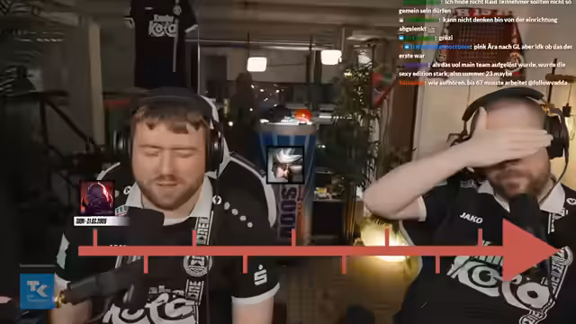 00:41:36Zur Unterhaltung wird ein interaktives Segment namens "Zeitstrahl-Spiel" veranstaltet. Bei diesem Spiel müssen die Streamer innerhalb verschiedener Kategorien wie Alter oder erste Prime-League-Siege die Personen oder Ereignisse in die richtige zeitliche Reihenfolge bringen. Das erste Spiel dreht sich um das Alter der eigenen Spieler, während das zweite die Sieger der Prime League in chronologischer Reihenfolge thematisiert. Dabei machen beide Streamer mehrere Fehler, was zu humorvollen Reaktionen führt.