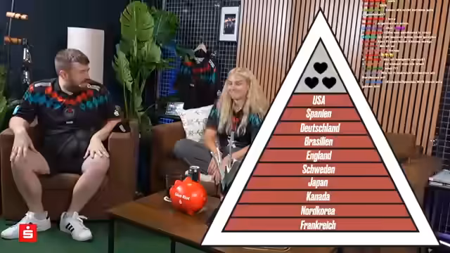 01:08:08Nach einer kurzen Pause wechselt das Thema zur FIFA-Weltrangliste der Frauenmannschaften. Die Teilnehmer müssen die Top 10 Länder erraten, wobei die USA als Platz 1 identifiziert wird. Weitere korrekte Tippungen sind Spanien auf Platz 2, Brasilien auf Platz 4 und Deutschland auf Platz 3. Durch schnelle Eingaben und den Input des Chats werden Schweden und Norwegen ebenfalls gefunden. Die Runde endet mit dem erfolgreichen Erraten von Kanada, wobei nur zwei Leben verbraucht wurden. Als Belohnung wird angedroht, dass der Verlierer einen Monat Putzarbeit übernehmen muss.