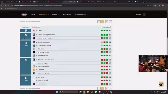 05:41:13Es wird diskutiert, ob Mustang den Malocha des Games verdient, was bejaht wird. C-Play gewinnt den ersten Acker-Match-Qualifier und qualifiziert sich damit direkt für die Playoffs. Es wird analysiert, dass Human Apex Predators individuell stark sind, aber ihre DPS nicht auf die Straße bringen. Die Endtabelle wird gezeigt, wobei es drei zweite Plätze mit vier Wins gibt. OP Energy Eclipse, das interne West-Energie-Team, ist ebenfalls am Start. Es wird erklärt, wie das Punktesystem funktioniert und wie Teams sich für die Playoffs qualifizieren können. Die Jungle Wackers haben einen Free Win erhalten, da Hello Kitty, die Gamers, nicht signed haben. Der nächste Qualifier findet am 11.10. statt, und man kann sich noch anmelden. Es wird wieder eine Challenge zwischen mir und Adrian geben. Auch Teams angemeldet, die zum Beispiel heute nicht konnten, können sich auch noch qualifizieren.