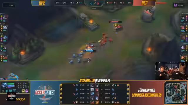 00:37:57Das erste Spiel des Ackermatch Qualifiers beginnt mit dem Aufeinandertreffen von OP Energy Eclipse (WestEnergy-Betriebssportteam) und NeppNeps. Die Teams zeigen ein breites Elo-Spektrum von Master bis Silber. Die Kommentatoren analysieren die Picks und Bans und gehen auf die Stärken und Schwächen der Champions ein. Besonderes Augenmerk liegt auf der Meta-Analyse und den möglichen Strategien der Teams während des Spiels, das mit einem starken Engagement beginnt.