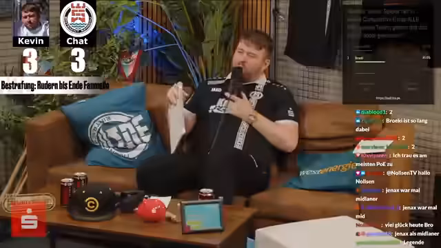 01:58:51Eine Quiz-Runde wird mit Kevin Westphal durchgeführt. Die Fragen beziehen sich auf diverse Themen wie Kevins Stats in Jarama-Game, Ursprung des Flammkuchens, legendäre E-Sport-Spieler, die alle Kills ihres Teams geholt haben, sowie Toni Kroos' Champions-League-Siege. Kevin beantwortet die Fragen teils durch das Konsultieren des Chats, was zu Diskussionen führt. Letztlich gewinnt Kevin das Quiz mit 5 zu 4 Fragen und muss als Strafe für den Rest der Fanmeile rudern.