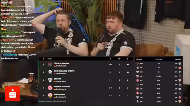 00:13:32Nach einem Ausblick auf anstehende Inhalte wie Podcast-Folgen und Darts-Streams konzentrieren sich die Moderatoren auf die League of Legends-Spiele. Es werden die Ergebnisse der vorherigen Spiele gegen G2 Nord und die damit verbundenen Tabellenstände erörtert. Die Diskussion dreht sich um die Chancen von Eintracht Spandau und die möglichen Gegner.