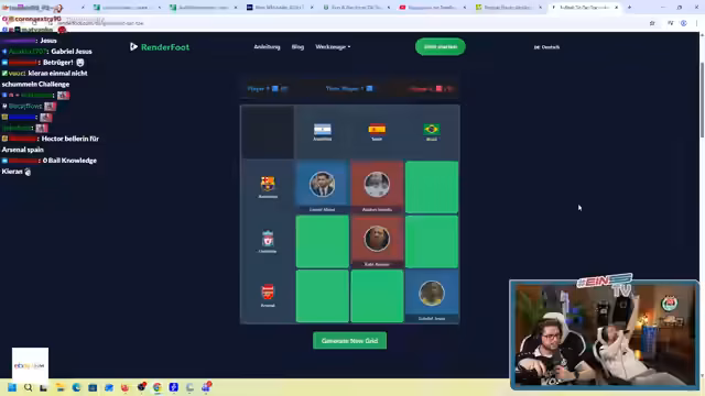 01:19:00Der Stream wechselt zu einem Quiz-Fußball-Tic-Tac-Toe, bei dem die Sprecher versuchen, Spieler zu finden, die für bestimmte Teams gespielt haben. Die Quiz-Teilnahme wird als unterhaltsam und herausfordernd beschrieben, insbesondere aufgrund der schwierigen Kombinationen und der Datenbank, die einige Spieler nicht enthält. Die Sprecher haben viel Spaß an dieser interaktiven Session und zeigen ihre Fußballkenntnisse.