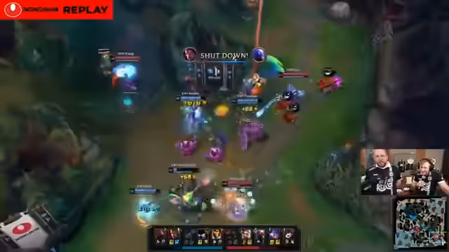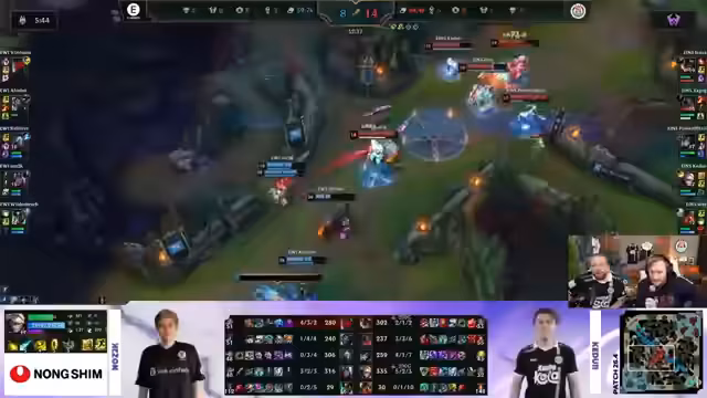 02:38:23Ein Teamfight endet erfolgreich und das Team sichert sich einen goldenen Drachen, zusätzlich zu den bereits vorhandenen drei Drakes. Die Stärke des Drachen wird im Vergleich zu anderen Objekten diskutiert. Die Item-Builds der Spieler, insbesondere die AD-Carrys mit sieben statt sechs Items, werden erklärt, wobei die Schuhe im Trinket-Slot angezeigt werden, aber nicht im Overlay. Nach einem weiteren erfolgreichen Fight, in dem der gegnerische AD-Carry eliminiert wird, wird der Baron Nashor bedroht. Es gibt eine Hektik um das Smite, doch die Moral der Gegner ist gebrochen. Kedui agiert aggressiv, Gambit mit einem E-Flash, während Wishiwashi einen Teamkollegen rettet und den Gegner eliminiert.