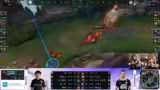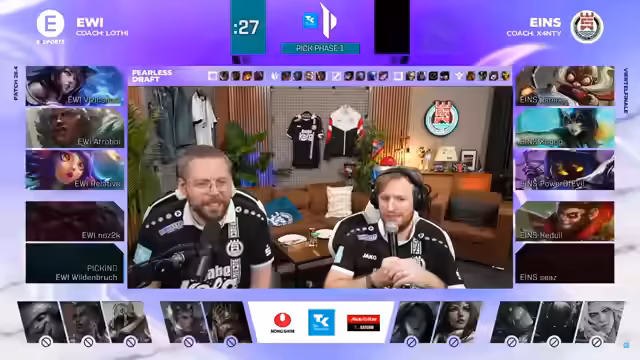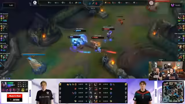 02:19:59Das Match startet hochgradig aggressiv. Afro Boy von EWI spielt extrem dreist und riskant, was ihm in der Anfangsphase einige Kills einbringt, aber auch zu gefährlichen Situationen führt. Die Teams tauschen sich Kills aus und die Crew kommentiert jede Aktion im Detail. Tristan von Eintracht Spandau muss als Ezreal besonders vorsichtig agieren, da er schlecht gegen den Mundo kontern kann.