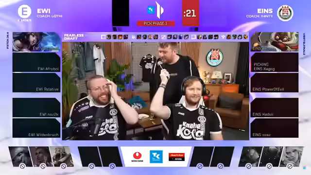 01:55:08Die Crew bereitet sich auf das anstehende Viertelfinale gegen EWI vor. Es gibt technische Herausforderungen, insbesondere mit den Mikrofonen und dem Sound. Währenddessen wird über den neuesten League of Legends-Patch gesprochen und analysiert, wie die Champion-Picks und Meta sich entwickeln. Die Tonprobleme werden erwähnt, eine Lösung wird aber in Aussicht gestellt. Schließlich muss ein Zwischenfall geklärt werden, bei dem eine Person den Raum riecht und es wird eine kurze, humorvolle Ablenkung mit dem Song 'Kevin gegen Shad' eingebaut.