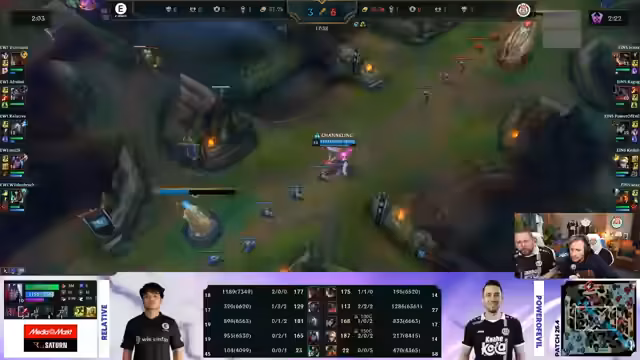 02:46:55Das Spiel geht in die finale Phase mit einem versuchten Dive auf die gegnerische Backline. Visicachi muss sich zurückziehen, hat aber keinen Teleport. Es kommt zu weiteren Kämpfen, in denen Afro Boy eliminiert wird. Das Team hat einen großen Vorteil, wirkt jedoch etwas nervös und trollt, anstatt sicher das Spiel zu beenden. Nach einer kurzen Pause und Diskussion über das Spiel werden weitere Fights um den Elder Dragon und den Baron Nashor ausgetragen. Letztlich wird der Nexus erfolgreich zerstört und das Spiel mit 1-0 gewonnen.