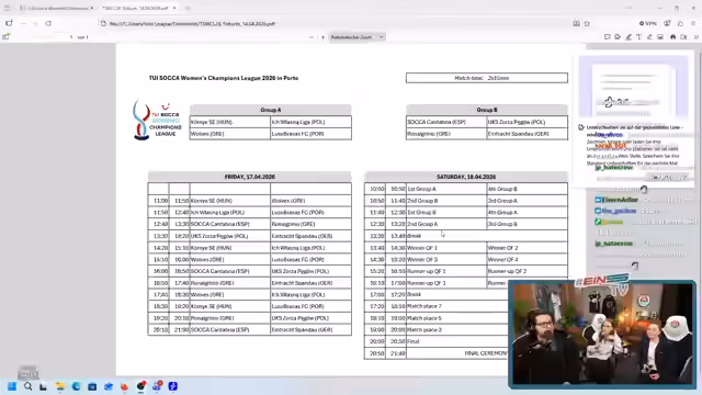 00:00:00Der Stream beginnt mit einer herzlichen Begrüßung der Zuschauer und stellt Gäste Lara und Maike vor. Erstmals streamt ein Trio bestehend aus Kieran, Lara und Maike. Die Moderatoren sprechen über das Frühstück der Gäste und erzählen von Premiere des Streams. Es geht um das letzte Gruppenspiel der TUI Socca Women's Champions League. Lara erwähnt ihre Verletzung Kreuzbandriss und den damit verbundenen comeback.