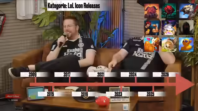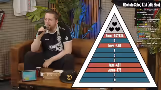 00:38:04Die Fanmeile bietet verschiedene interaktive Spiele wie 'Pyramide' bei dem Begriffe erraten werden müssen. Aktuell wurde ein Spiel mit LOL Champions höchster Solo-Q KDA gespielt, wobei Enchanter und Tank-Champions im Fokus standen. Gleichzeitig gab es technische Herausforderungen, als Tristan das Internet verlor und eine schnelle Lösung erforderlich war. Nachdem das Problem vorübergehend gelöst wurde, konnten die Aktivitäten fortgesetzt werden.
