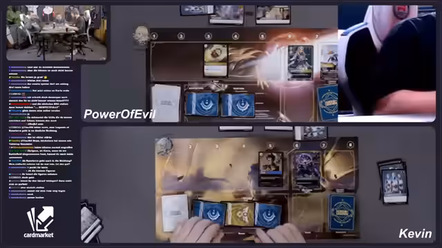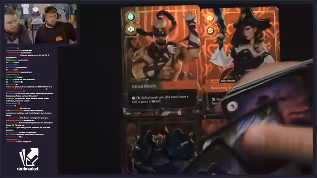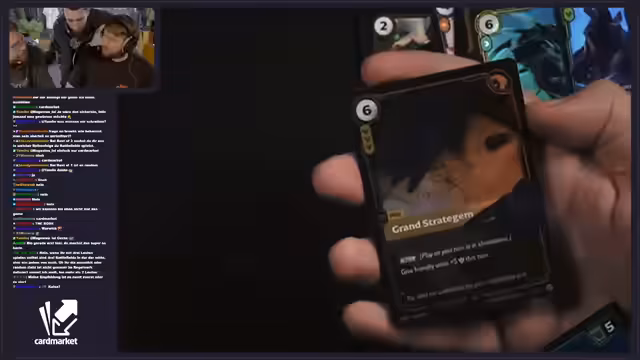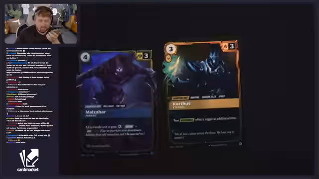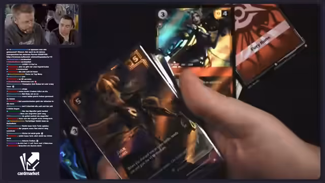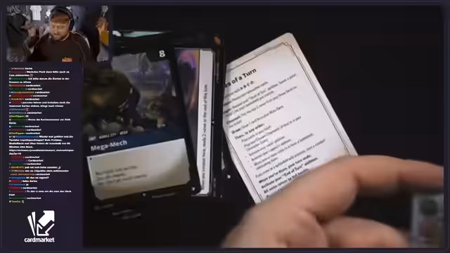 02:01:32Während des Streams wird die Partnerschaft mit Cardmarket vorgestellt. Es wird erklärt, dass Cardmarket eine sichere Handelsplattform ist, bei der Zahlungen erst bei Warenempfang erfolgen. Tristan Schrage wird als Kooperationspartner erwähnt, der mit Cardmarket bei Magic the Gathering zusammenarbeitet. Zusätzlich wird eine Gutschein-Aktion angekündigt: Wenn der Chat 'Cardmarket' spammt, wird ein 20-Euro-Gutschein verlost. Der Streamer demonstriert zudem, wie man die Cardmarket-Webseite nutzt, um Karten wie die Karte mit der Nummer OGN 308 zu finden.