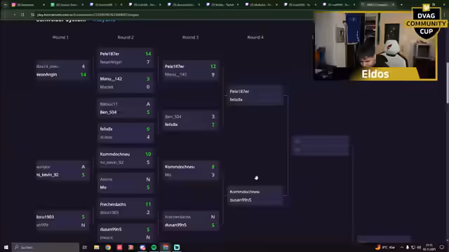 03:36:37Die Paarungen für das Viertelfinale des DVAG Cups werden bekannt gegeben. Es stehen sich unter anderem Felix gegen Dusan, Holm gegen Maki und DBK gegen Maiz gegenüber. Diese matchups werden von Eldos und dem Chat als besonders spannend und hochklassig eingestuft, da alle verbliebenen Spieler durch die ersten vier Runden gekämpft haben und somit Top-Niveau versprechen.