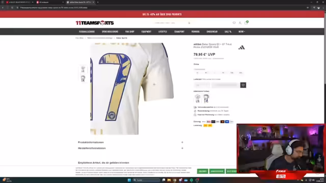 03:15:31Die Aufmerksamkeit verlagert sich vom Gameplay zum Marketing. Der Streamer präsentiert das neue Trikot von Delay Sports, das in Zusammenarbeit mit Adidas und 11 Teamsports produziert wurde. Er betont die hohe Qualität und den professionellen Schnitt, der einem Bundesligatrikot entsprechen soll. Die Preise für Erwachsene und Kinder sowie Details zur Veredelung werden vorgestellt und zur Diskussion im Chat angeregt.