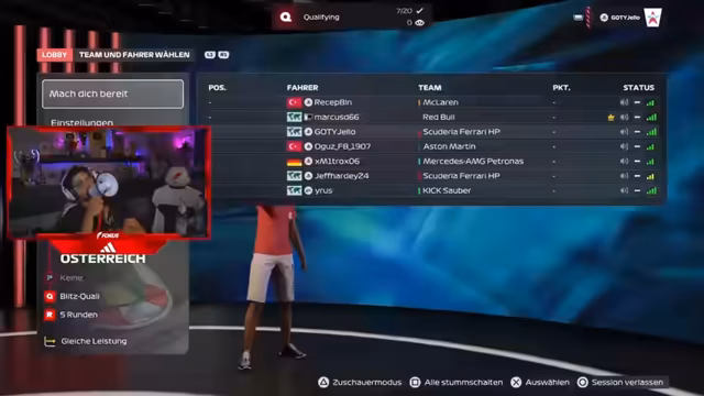 02:30:21Der Streamer bereitet sich auf das bevorstehende Formel 1-Event vor, erwähnt den Wunsch, gegen bestimmte Fahrer zu starten und diskutiert über seine Leistungen im Training. Er spricht auch über technische Schwierigkeiten mit seinem Controller und das Fehlen eines Rückspiegels im Spiel. Gleichzeitig gibt es Diskussionen über Teamzugehörigkeiten und Turnierregeln.