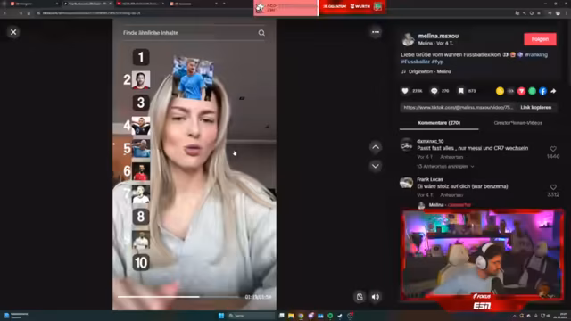 04:13:07Das Gespräch dreht sich intensiv um Fußball, insbesondere um eine Rangliste von Spielern. Der Streamer ist überzeugt von Robert Glatzel als wichtiger Faktor für den HSV und diskutiert die Positionen von stars wie Messi, Ronaldo und Mbappé. Es entsteht eine lebhafte Debatte, wer besser ist, mit einem Fokus auf ihre Torstatistiken und den Einfluss auf das Spiel. Dabei werden Vorurteile, wie die Annahme, Mbappé sei bei Real Madrid gescheitert, anhand der Zahlen widerlegt und die Statistiken der Spieler im Detail verglichen und analysiert.