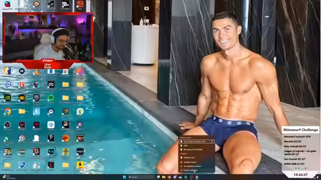 01:24:10Der Streamer beschäftigt sich weiter mit der Wahrscheinlichkeitsberechnung bei der Münzwurf-Challenge und stellt fest, dass es eine 9,4%ige Wahrscheinlichkeit gibt, dass von 17 Wins nur 6 gezählt werden. Er wechselt dann das Spiel zu Valorant und erwähnt, dass sie noch bis 5 Uhr Zeit haben. Er erörtert auch verschiedene Spiele, die sie spielen könnten, wie Rainbow Six, League of Legends und Valorant, und betont, dass Valorant das einzige Spiel ist, das sie noch brechen könnte.