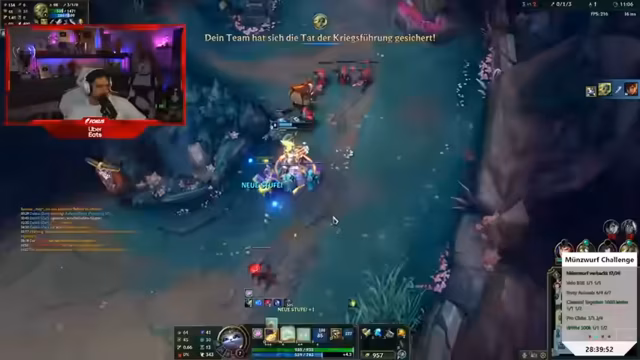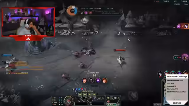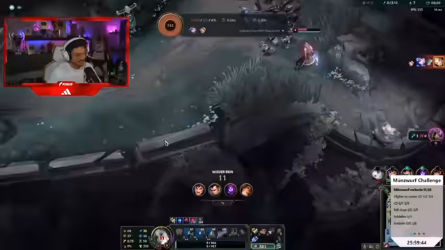 11:51:45Die Streamer erleben Höhen und Tiefen während ihrer League-of-Legands-Runden, wobei sie sowohl Erfolge als auch Misserfolge verzeichnen. Die Spieler ringen mit der Koordination ihrer Angriffe und der Verteidigung ihrer Positionen auf der Karte. Die Gegner werden als herausfordernd eingestuft, und einige Teilnehmer haben Schwierigkeiten, mit der Spielmechanik und der Strategie Schritt zu halten, was zu Frustration und verbalem Austausch führt.