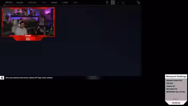 14:58:53Die Teilnehmer Mert, Jussef und Maus beginnen mit der zweiten Großen Münzwurf Challenge auf Rainbow Six Siege. Zunächst treten sie technischen Problemen beim Verbinden mit dem Server entgegen, während Streamer Eliasn97 die Teilnehmer mit Witz und Ausrufen begleitet. Die erste Phase beinhaltet das Durchspielen eines Tutorials für einen neuen Account durch Eli, was大约 eine halbe Stunde dauert. In der Zwischenzeit werden Accounts getauscht und Herausforderungen besprochen, während Streamsnapper und technische Schwierigkeiten für Unterbrechungen sorgen.
