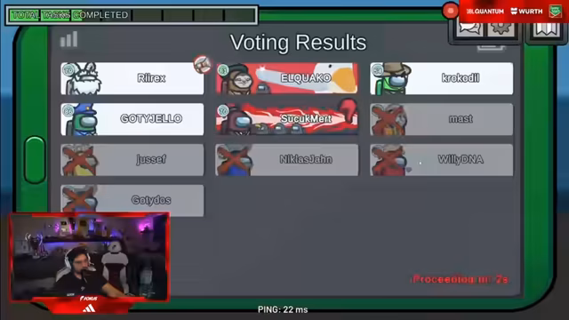 02:29:09In dieser Sequenz spielt die Gruppe Among Us mit hoher emotionaler Beteiligung. Es gibt heftige Diskussionen zwischen den Spielern über mögliche Imposter-Identitäten, wobei spielerische Beleidigungen und aggressive Argumentationen ausgetauscht werden. Die Runde endet mit einem Sieg für die Crewmates, nachdem ein Guardian Angel einen Spieler zum richtigen Zeitpunkt beschützt hat und so ein geplanter Doppelkill vereitelt wurde.