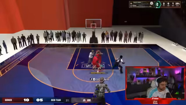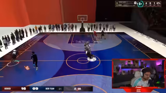 04:48:31Nachdem der Charakter fertiggestellt ist, geht es ins Pro-Am-Theater, um Teamspiele zu bestreiten. Der Streamer spielt mit anderen Zuschauern, die als Sydney und Adam bezeichnet werden. Das Team kommuniziert intensiv über Spielzüge wie Pick and Rolls, versucht, schnelle Fastbreaks zu initiieren und kämpft um Rebounds. Die Partien sind von schnellem, aggressivem Spielstil geprägt, der jedoch auch zu Unsicherheiten und Fehlern in der Verteidigung führt, was zu einer gemischten Bilanz führt.