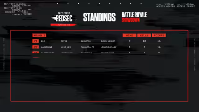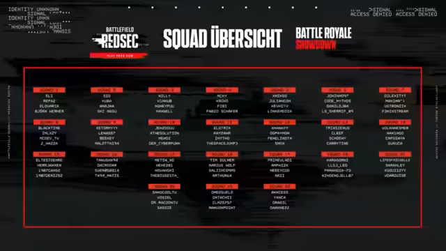Das kostenlose Battlefield REDSEC Turnier, basierend auf der DNA von Battlefield, vereint 24 Squads à 4 Spieler im Battle Royale-Modus. 16 Spieler treten im Studio an, 80 online. Ziel ist es, als letztes Squad zu überleben, indem gelandet, gelootet und gekämpft wird, während die Zone schrumpft. Team-Wiederbelebungen, Fahrzeuge und Zerstörung sind aktiv. Vier Runden à ca. 30 Minuten werden gespielt, gefolgt von kurzen Pausen zur Punkteauswertung. Das Team mit der höchsten Gesamtpunktzahl gewinnt.