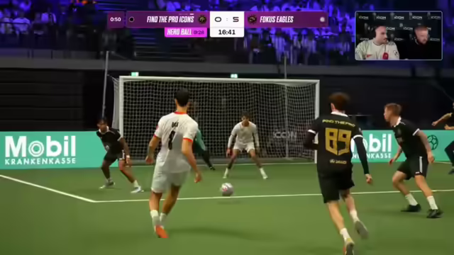 00:26:47Das erste Spiel des Abends ist Berlin City gegen Bürgeramt. Berlin City geht dominant ins Spiel, während Bürgeramt eingeschüchtert wirkt. Es wird über die Passiv-Play-Regel diskutiert und wann sie in Kraft tritt. In der Halbzeit steht es 1:0 für Berlin City durch ein Tor von Furkan Aas. In der zweiten Halbzeit nimmt Bürgeramt ein Timeout, um sich neu zu justieren und den Hero Ball auszuspielen. Berlin City gewinnt das Spiel letztendlich mit 4:2, wobei Noah Jones zum MVP der Partie gewählt wird. Es wird eine neue Rubrik namens Icon League Bingo eingeführt, bei der die Zuschauer Amazon-Gutscheine gewinnen können.