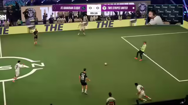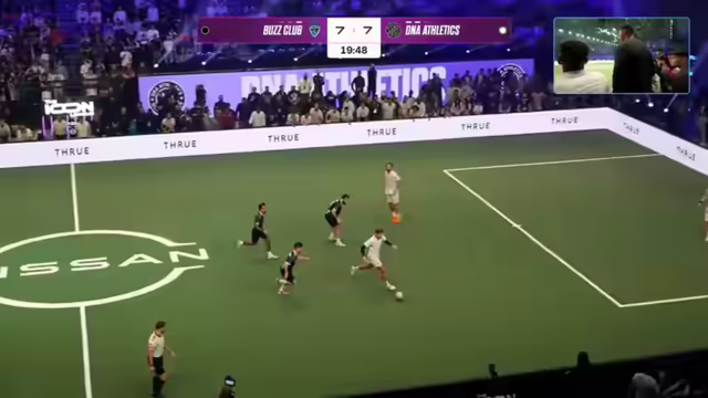02:00:07Es folgt die Vorstellung des nächsten Spiels zwischen BuzzClub und DNA. Die Schiedsrichter sind Hannes Kresser, Fabian Reuter und Timon Schulz. Als Rule Breaker werden Five Shots und Triple Threat ausgewählt. Dennis Lohmann steht wieder im Tor von BuzzClub, und Halil Ibrahim Yilmaz hat sich als Goalgetter etabliert. Bei DNA steht Koprowski im Tor, da Akbakla verletzt ist. Modul ist wieder am Start und wird als MVP bezeichnet. Es wird spekuliert, wer das Spiel gewinnen wird, wobei BuzzClub aufgrund der Veränderungen im Team favorisiert wird. Das Spiel beginnt mit einem frühen Tor für BuzzClub, und es gibt eine gelbe Karte für Gorgiev von DNA. Der Kommentator fragt sich, ob er bei BuzzClub hätte einlaufen müssen.