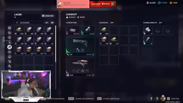 06:04:43Der Streamer bereitet sich auf eine neue Runde vor und muss sein Inventar verwalten. Er hat nur wenige Verbände und sucht nach Stoff, um welche herzustellen. Er findet einen Mitspieler namens Scrappy, von dem er Dinge wie Stoff bekommen kann. Überlegt, welche Waffen er mitnehmen soll, entscheidet sich aber für eine 'männliche' Runde mit einer Venator. Er erwähnt auch, dass er die Werkbank verbessern möchte, um bessere Sachen craften zu können, und stellt fest, dass er stirbt, da er mit einem kostenlosen Loadout startet.
