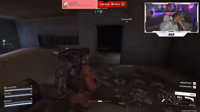05:34:40Nach einem Kampf überlegen die Streamer und seine Teammates, wie sie weiter vorgehen sollten. Der Streamer möchte mit einem Gegner reden, versucht ihn zu kontaktieren und freundlich zu wirken. Er überlegt, einen Nacht-Raid mit einem kostenlosen Loadout zu starten, um Loot zu sammeln, ohne etwas zu verlieren. Allerdings befürchtet er, dass es sich um eine reine PvP-Hölle handeln könnte und sein Inventar voll ist. Er muss auch lernen, das In-Round-Crafting zu nutzen, um sich während des Kampfes Dinge wie Bandagen herstellen zu können.