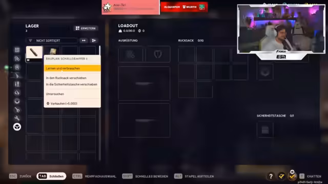 05:13:45Nach der erfolgreichen Extraktion beginnt die Nachbereitung des Raids. Der Rucksack wird ausgepackt und die gesamte Beute wird analysiert. Wichtig ist die Sicherung wertvoller Baupläne in einer speziellen Sicherheitstasche, damit diese nicht im nächsten Raid verloren gehen. Anschließend werden die gefundenen Baupläne erlernt, um im Spiel neue Waffen und Gegenstände herstellen zu können, was langfristig die Überlebenswahrscheinlichkeit erhöht.