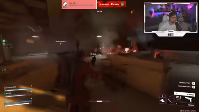05:30:37Es kommt zu einem intensiven Feuergefecht auf den Dächern und Brücken einer Map. Der Streamer und seine Teammates werden von Gegnern unter Druck gesetzt und müssen sich bewegen, um aus dem Schussfeld zu kommen. Es werden Gegner gesichtet, auf die geschossen wird, und der Streamer ruft ständig nach Deckung und Heilung. Er ist mehrfach in Gefahr, wird getroffen und muss sich zurückziehen, während er versucht, den Überblick über die Lage zu behalten und seine Teammates zu warnen.