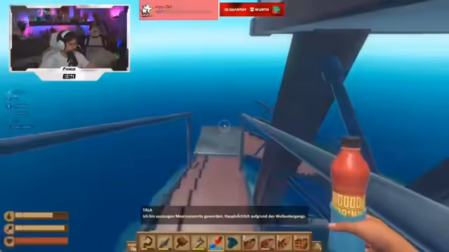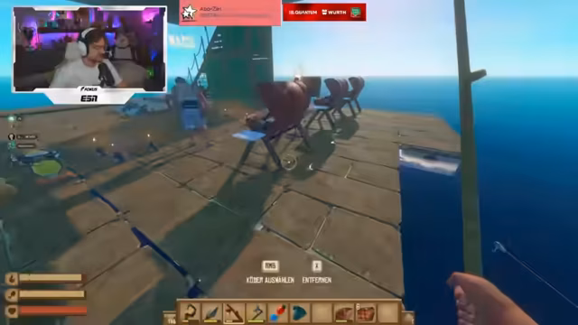 03:23:39Nachdem ein neues Floß segment fertiggestellt wurde, konzentrieren sich die Bemühungen auf die weitere Verbesserung. Der Streamer plant, sich auf die Beschaffung von Seetang, Schrott und Eisen zu konzentrieren und gibt explizit an, dass er nur einen Kugelfish benötigt. Eine Diskussion entsteht über die Funktion des Segels und der Weg von der Insel, wobei es technisches Unverständnis gibt. Zeitgleich wird ein Gespräch über Filmfiguren wie Legolas und Aragon angestoßen, das in eine tiefer gehende Diskussion über mögliche Wortdopplungen im Deutschen wie Ton und Ton oder Bank und Bank abdriftet.