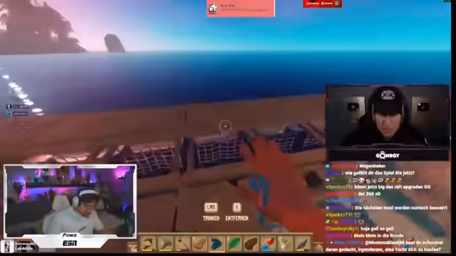 01:42:25Der Streamer und seine Co-Spieler spielen das Spiel Raft. Der Fokus liegt auf dem Erkunden neuer Inseln, dem Sammeln von Ressourcen wie Holz, Schrott und Metall, sowie dem Bau und der Erweiterung des Floßes. Die Gruppe kämpft dabei mit Koordinationsproblemen, da jeder nur mit sich selbst spricht und sich unkoordiniert verhält. Auch das Erkennen der Story-Elemente und das Verarbeiten von Nachrichten auf den Inseln spielen eine wichtige Rolle für den Fortschritt im Spiel.