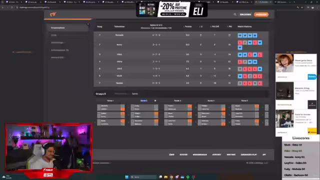 01:58:00Der zweite Spieltag des E-Sport-Turniers ist in vollem Gange. Es gab einige interessante Ergebnisse: Johnny Koray spielte 5-5, Nassim Eldos gewann 6-4, Nasada besiegte Umut 4-3 und Batschore, der aktuelle Weltmeister, deklassierte Mo mit 11-4. Die aktuelle Tabelle zeigt Eldos mit zwei Siegen und somit sechs Punkten an der Spitze. Es folgen mehrere Spieler mit jeweils drei oder einem Punkt. In der nächsten Runde spielt Nassim gegen Koray, Musli gegen Johnny, Eldos gegen Nasada, Doyen gegen Bacciore, Beast gegen Olieto und Levi gegen Foki. Es wurde klargestellt, dass Spielerwechsel jederzeit möglich sind. Einige Spieler sind bei bekannten Fußballvereinen als E-Sportler aktiv, wie Fuki bei Bayern München und Doolen bei Stuttgart.