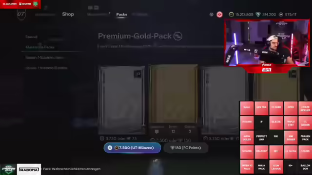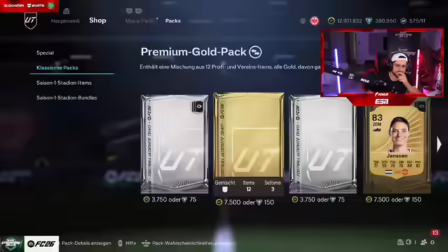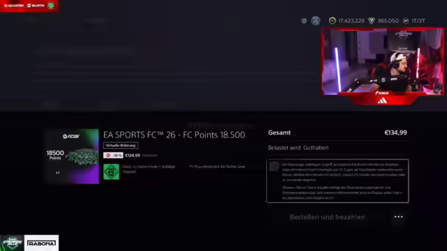 12:02:31Es wird über die bisherigen Ausgaben für FIFA Points gesprochen und eine Hochrechnung angestellt, wie viel man mit dem aktuellen 'Pack Luck' noch erreichen könnte. Der Streamer hat bereits 4.000 Euro investiert und daraus 17 Millionen Coins generiert. Bei gleichbleibendem Glück könnten weitere 6.000 Euro Investition zu insgesamt 42 Millionen Coins führen, was für das gewünschte Team reichen würde. Es wird festgestellt, dass der aktuelle 'Pack Luck' nicht außergewöhnlich gut ist. Es wird überlegt, ob man die FIFA Points als Geschäftsausgabe absetzen kann. Insgesamt wurden bereits 8.000 Euro investiert, wobei zwischenzeitlich von 6.100 Euro die Rede war. Es wird spekuliert, ob das Ziehen einer sehr guten Karte das Glück für nachfolgende Packs beeinflusst. Der Streamer hat die Hälfte des geplanten Investments bereits getätigt und daraus 17,5 Millionen Coins gemacht. Es werden Überlegungen angestellt, ob man sich von dem Erlös ein Auto kaufen sollte. Seit dem Bingo der 'Beach-Kinder' habe ich keinen Walkout mehr gezogen. Es wird der Wunsch geäußert, dass EA FC 26 Leitungen freimachen soll, damit das Ziehen von Spielern wieder besser wird.
