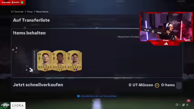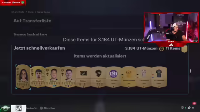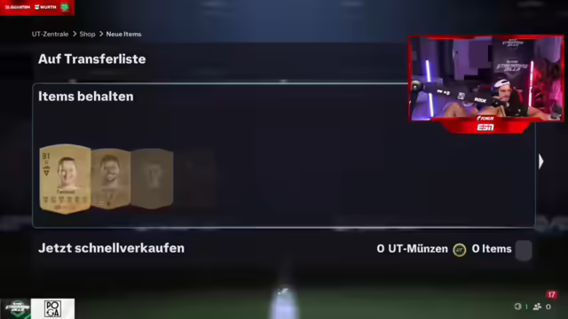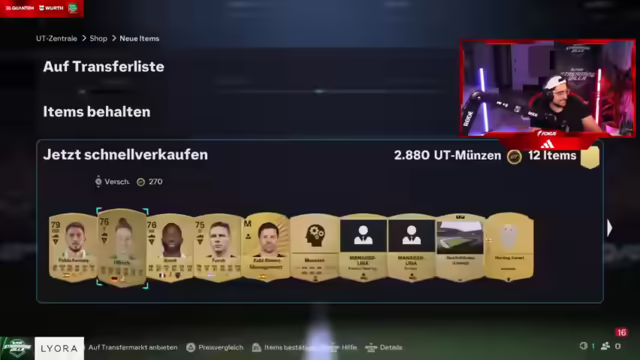 12:54:04Der Streamer äußert sich emotional und sagt, er würde weinen, wenn er etwas abgeben müsste. Es wird überlegt, woher Willi seine drei Millionen Coins hat. Der Streamer zieht Tonali und stellt fest, dass es Phasen gibt, in denen man plötzlich viele gute Spieler zieht. Es wird überlegt, ob R9 auf dem Markt ist. Der Streamer gewinnt ein Spiel mit 8:0 und küsst die Herzen der Zuschauer. Er betont, dass die Streaming-Villa mehr wert ist als 700.000 Euro, da sie einzigartige Erlebnisse bietet. Es wird überlegt, wie viele FIFA Points die anderen noch haben und ob sie aufladen werden. Der Streamer zieht Garnacho und findet es schlimm, dass keine neuen Spieler auf den Markt kommen. Es wird über den Elfer-Call diskutiert. Der Streamer spielt nicht seine Taktiken. Es wird über die Elo-Wertung diskutiert. Der Streamer zieht wieder einen Draft. Es wird festgestellt, dass es Phasen gibt, in denen man viele Workouts zieht. Der Streamer zieht Tonali und Rodrigo. Es wird über die Sydney Step diskutiert. Es wird überlegt, ob man wieder einen Draft spielen soll. Der Shop wird aktualisiert. Der Streamer zieht einen Boy-Mon. Es wird überlegt, ob es zu viel verlangt ist, eine Acht-Millionen-Karte zu ziehen. Der Streamer zieht McTominay und Rodrigo. Es wird festgestellt, dass man in einer Elo ist, in der Scheiße mit Pisse zusammentrifft.