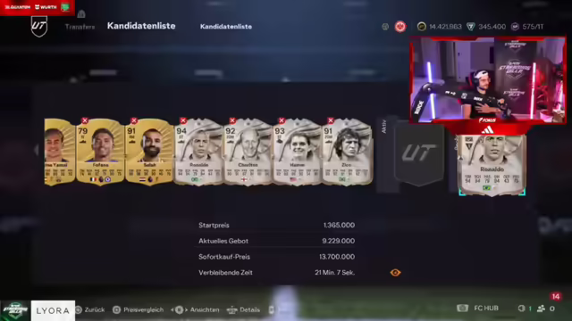 02:14:51Es wird über das Fehlen neuer 'Heroes' wie Quaresma im Spiel diskutiert, wobei erwähnt wird, dass diese erst in etwa einem Monat verfügbar sein werden. Anschließend geht es um die Qualität der Packs, die als 'schlecht' bezeichnet werden, mit Ausnahme von Rafinha und Musiala. Es wird erwartet, dass das Gebiet, in das der Streamer sich begibt, etwa 10 Minuten dauern wird, und es wird scherzhaft angedeutet, dass ein schneller Verkauf für 12 Millionen unsympathisch wäre. Der Streamer zieht sich daraufhin um und es wird kurz über Draft-Spiele und die Kosten von Spielern wie Gabriel diskutiert, wobei ein Pack-Fehler erwähnt wird, der möglicherweise zu einem Fund führte. Es folgt eine Diskussion über den Wert von R9 und ob 12 Millionen ein guter Preis sind, wobei der Streamer erwähnt, dass er ihn zuvor für 11 Millionen hatte. Es wird beschlossen, drei neue Packs zu ziehen und die Reaktionen der Zuschauer zu beobachten, wobei Siran aus Bielefeld erwähnt wird, der 100 Zaps verspricht, wenn bestimmte Bedingungen erfüllt sind. Der Streamer entscheidet sich gegen den Kauf von R9 für 12 Millionen, da er keinen Sinn darin sieht und auf eine Auktion in der Nacht hofft. Die hohen Coin-Bestände vieler Spieler werden als neuartig kommentiert und es wird die Erwartung geäußert, R9 später am Tag zu bekommen.