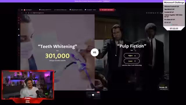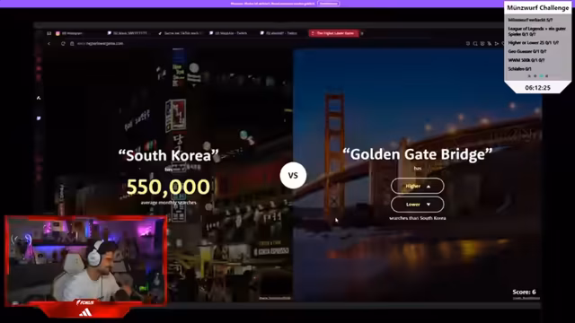 06:48:00Die Unterhaltung dreht sich um ein Wort- und Ratespiel bei dem die Teilnehmer versuchen müssen zu erraten, wie häufig Suchbegriffe bei Google eingegeben werden. Die Teilnehmer verwenden dabei Begriffe wie 'Rohat', 'Apple Laptop', 'Gambling' und 'Sex-Sachen', während sie ständig zwischen 'hoch' und 'runter' bei den geschätzten Suchzahlen abstimmen. Die Interaktion ist geprägt von vielsagenden Kommentaren und humorvollen Einschüben, während die Streamer versuchen, die richtige Vorhersage zu treffen.