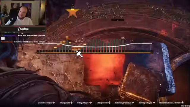06:28:24Der Streamer ringt mit dem komplexen Schmiede-System des Spiels. Er versteht die Anleitung nicht, die die weißen Linien als Formvorgabe und die roten Striche als Weg zur Verformung des Materials erklärt. Verschiedene Versuche, das Material in die Form zu schlagen, scheitern und führen nur zu maximal zwei von möglichen vier Sternen. Trotz intensiver Bemühungen und Anleitungen im Chat schafft er es nicht, die Mechanik zu meistern, was ihn sehr frustriert und ihn das Spiel als zu kompliziert empfinden lässt.